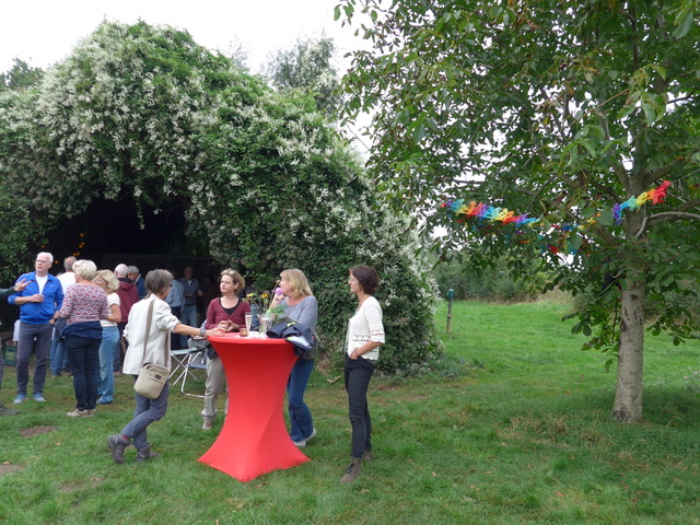 We werden welkom geheten door de feestcommissie met een glaasje prosecco om te klinken en te drinken op de nieuwe tuin. Daarna was er koffie en thee met zelfgebakken cakes en taarten. |